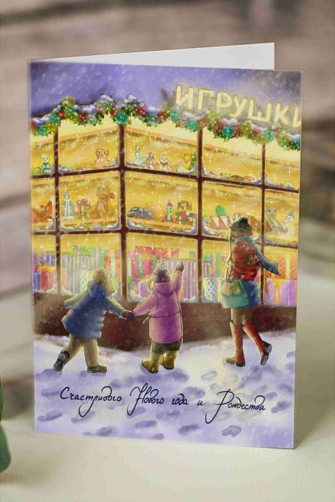 Открытка выполнена на высококачественной дизайнерской бумаге. В эти открытки мы вкладываем больше внимания и работы. Чтобы нарисовать такую открытку художнику нужен целый день. Каждая дизайнерская открытка — это предмет творчества наших художников. Можно сказать, что это картина в миниатюре.
