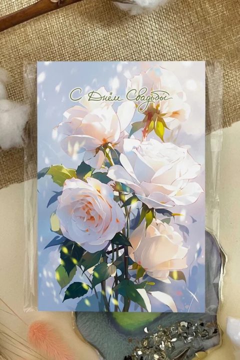 Открытка выполнена на высококачественной дизайнерской бумаге. В эти открытки мы вкладываем больше внимания и работы. Чтобы нарисовать такую открытку художнику нужен целый день. Каждая дизайнерская открытка — это предмет творчества наших художников. Можно сказать, что это картина в миниатюре.