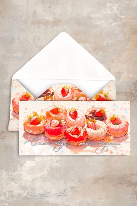 Конверт выполнен на высококачественной дизайнерской бумаге. Все наши конверты мы полностью рисуем сами. Уделяя огромное внимание мелочам, мы получаем уникальные конверты, пропитанные любовью и нежностью.